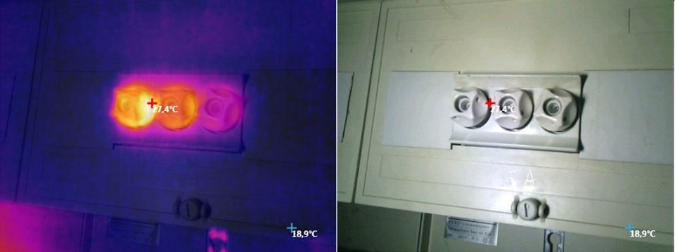 Unten: Mit einer Wärmebildkamera ist es möglich, schnell und einfach Überlastungen in Verteilern aufzuspüren. Beseitigung von Überlastungen kann helfen, Brände zu verhindern. Ich arbeite mit einer Wärmebildkamera von Bosch.